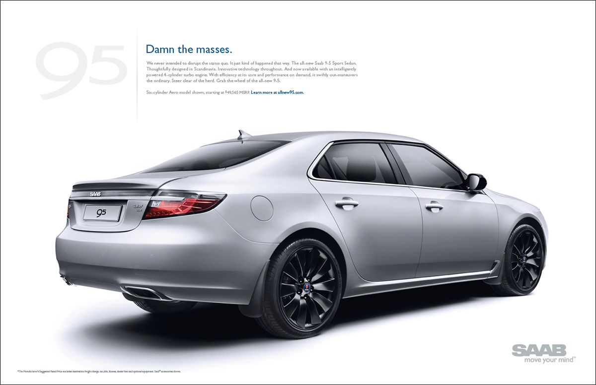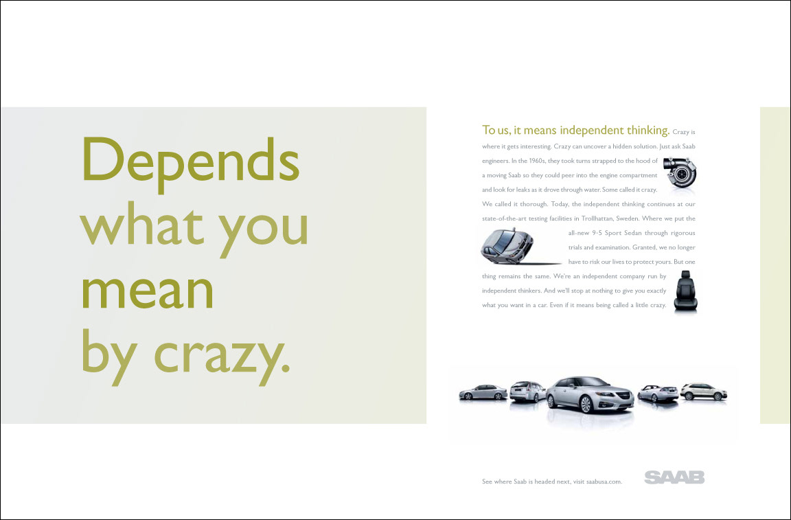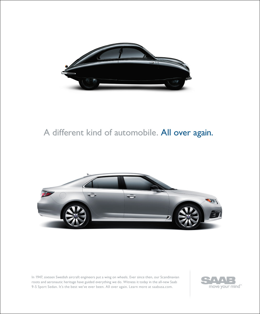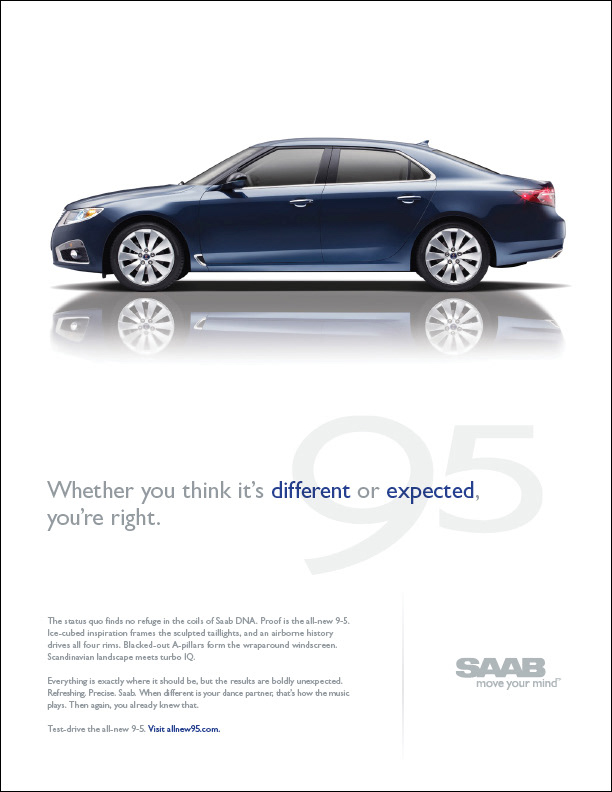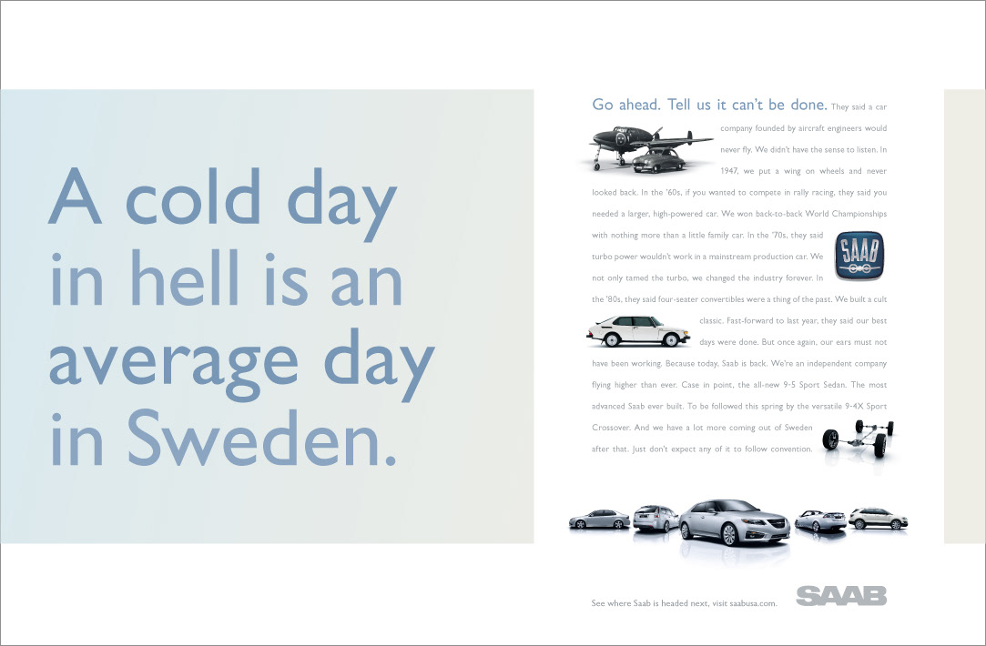 Saab Print/OOH Magazine, Newspaper and billboards 2011 D Show awards in all three categories ECD/EVP: Matt Canzaano CD/VP/Writer: Matt Soldan