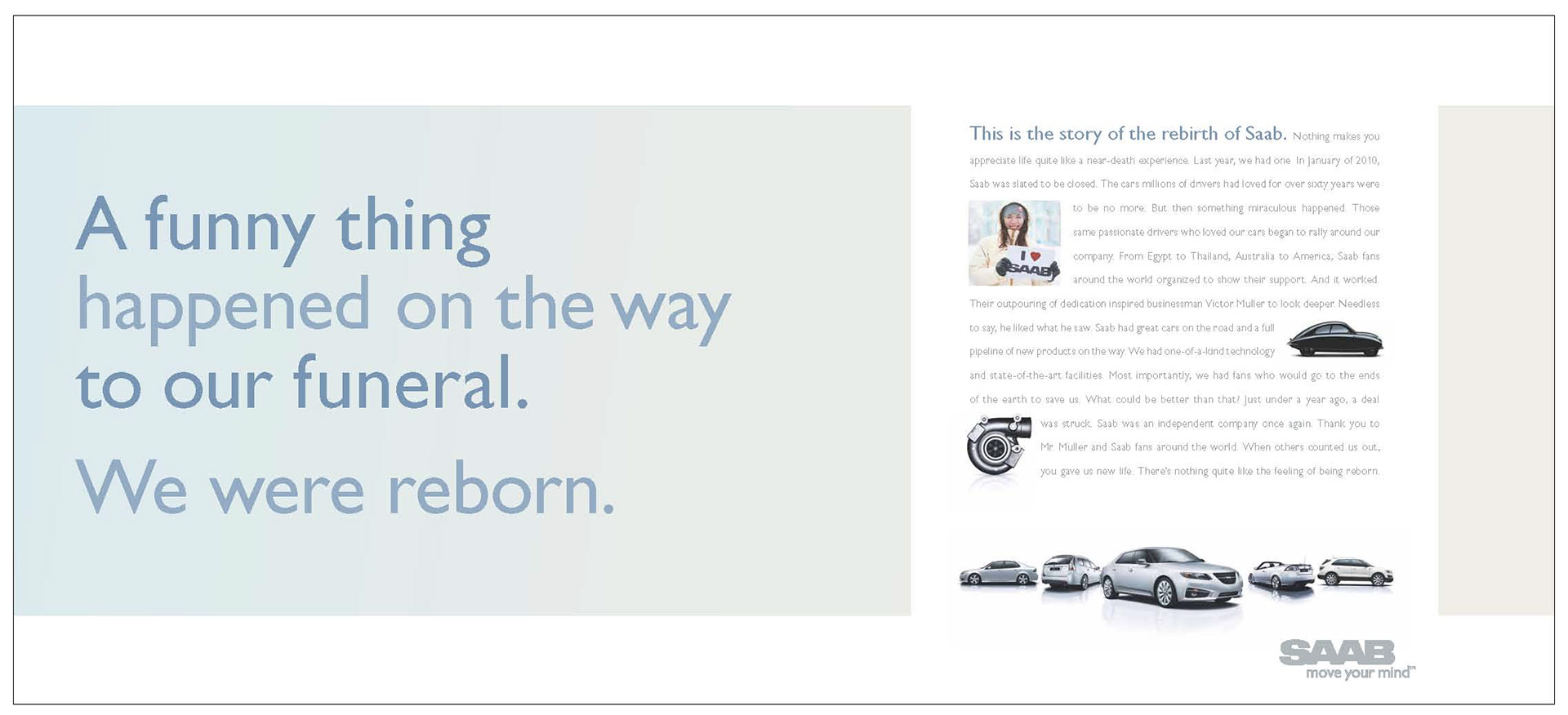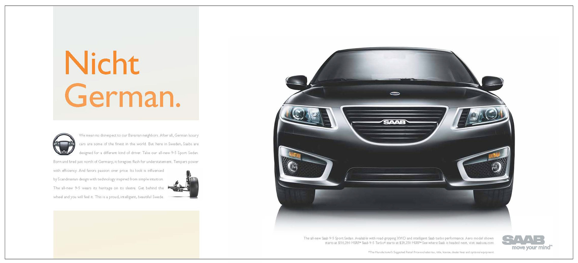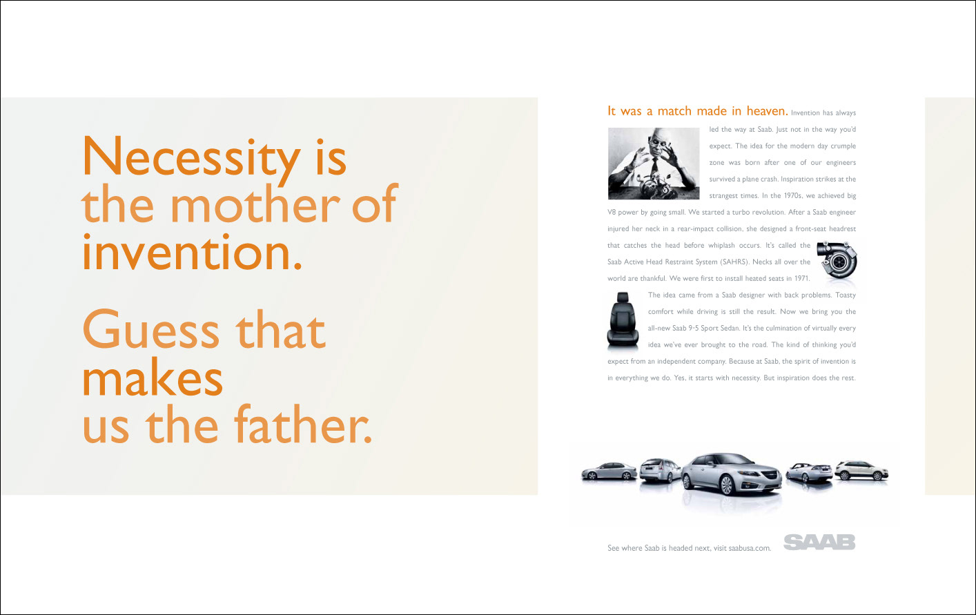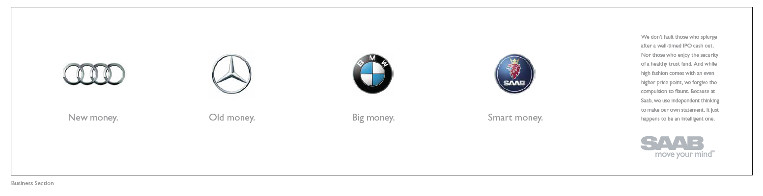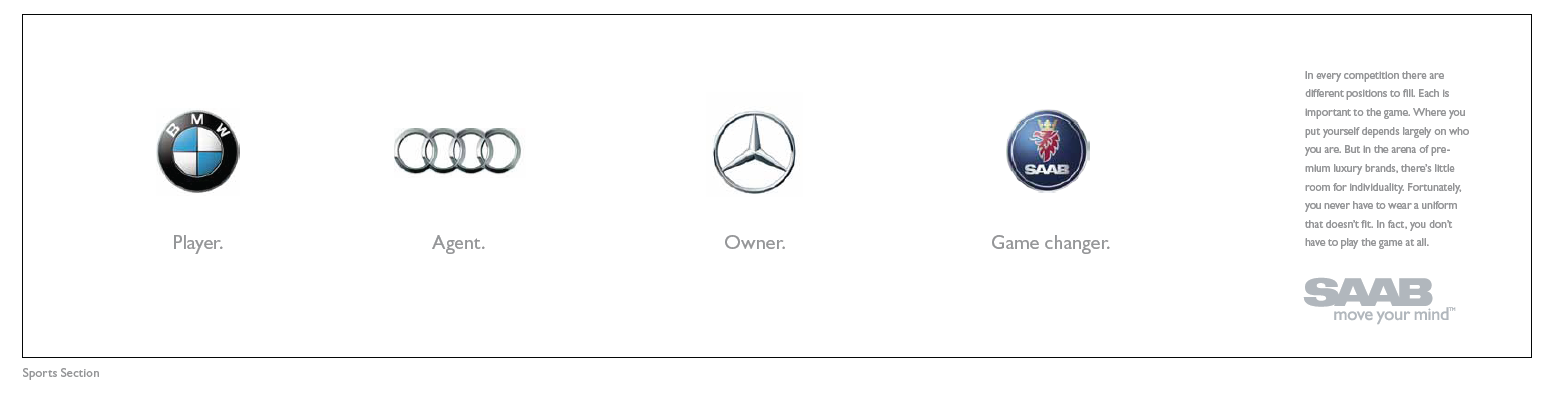 Saab Print/OOH Magazine, Newspaper and billboards 2011 D Show awards in all three categories ECD/EVP: Matt Canzaano CD/VP/Writer: Matt Soldan